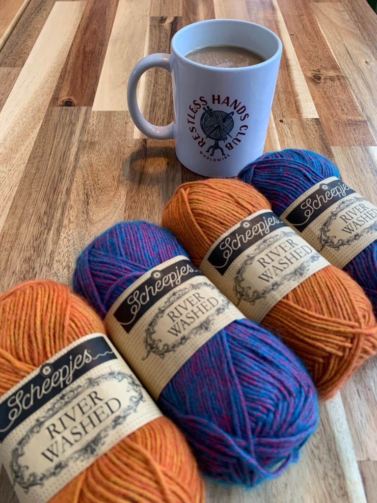 You will need 9 balls of the main color, which in my case will be the blue Colorado and 7 balls of the pattern color which is the orange Mersey.