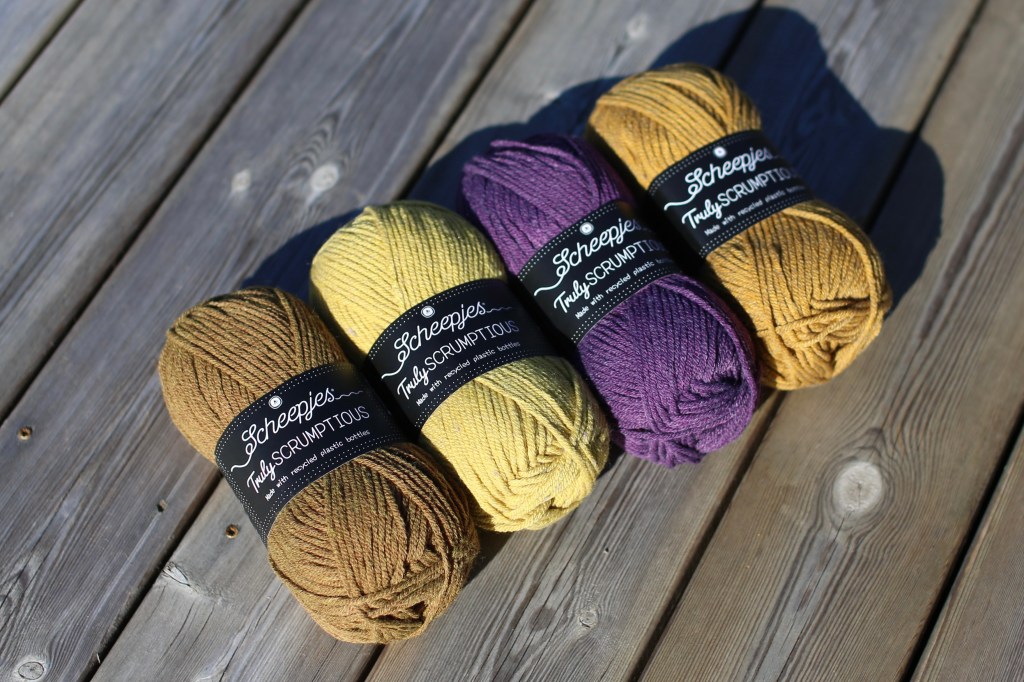 Little sister “Scrumptious” is a dk weight yarn (100g/300meters) and big brother “Truly Scrumptious” is an Aran weight yarn (100g/108meters) and both share the same fiber content: 50% recycled polyester (recycled plastic bottles) and 50% acrylic makes this yarn super soft and super strong at the same time.
