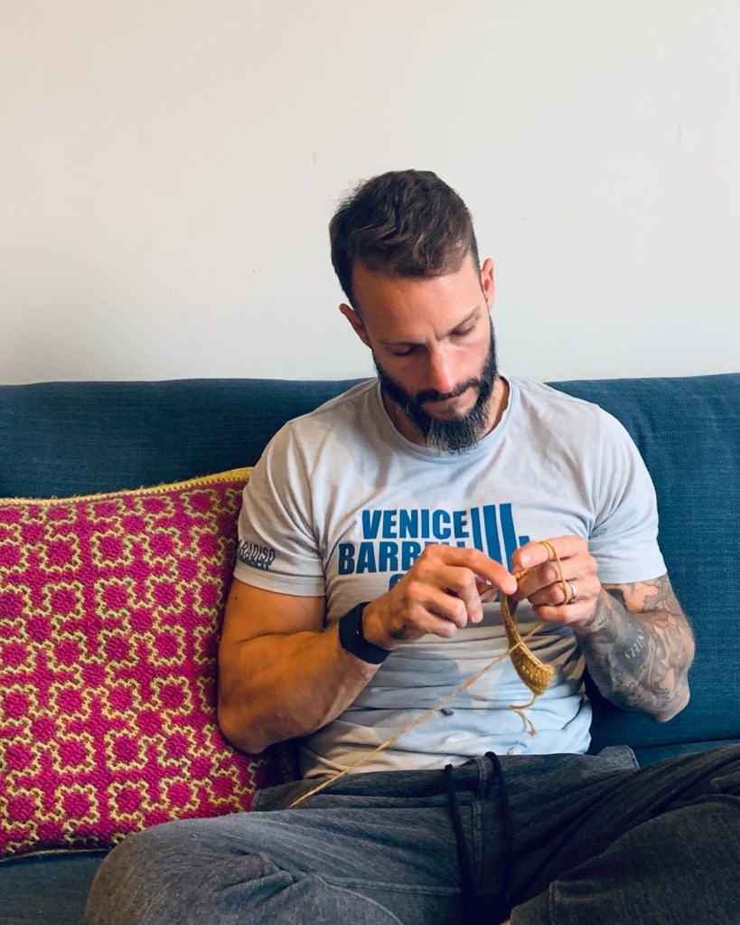My friend Johann, Crossfit Level ll coach and Krav Maga instructor was here in Sweden for a visit and as he has a CrossFit mindset which means that he has an open attitude towards learning new skills and is always up for a new challenge. I was kind of surprised as I did not think he would be interested in testing fiber crafts, but he wanted to learn how to crochet