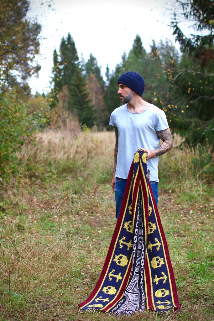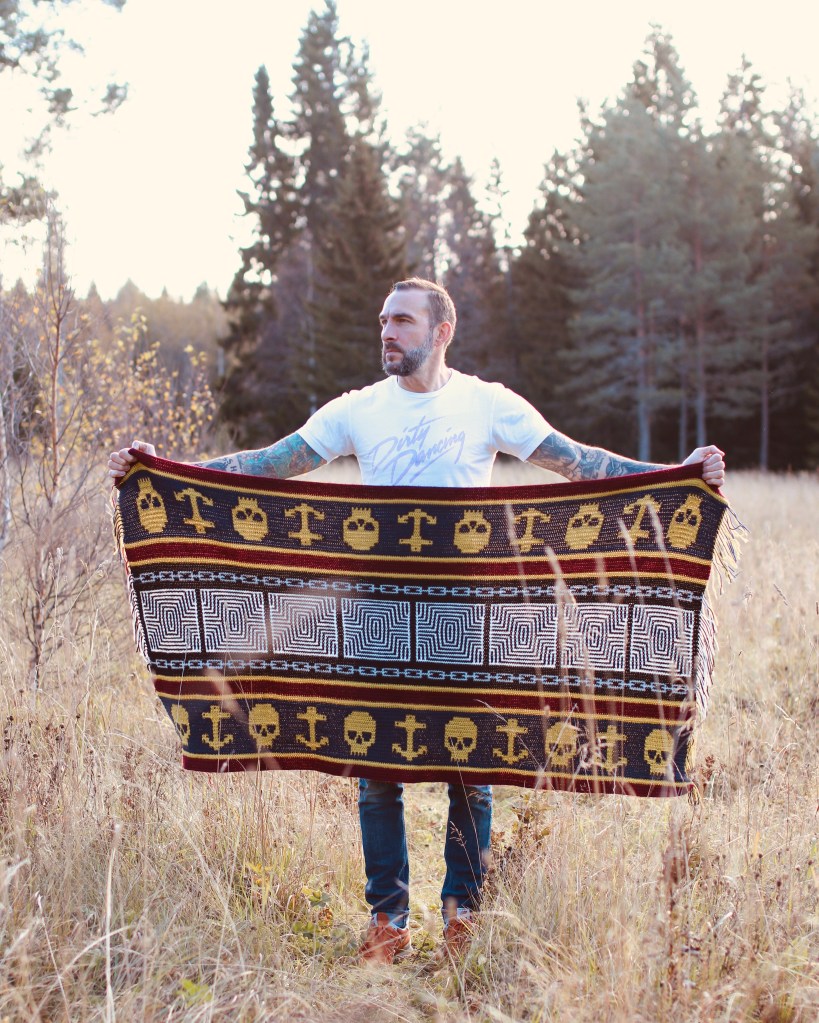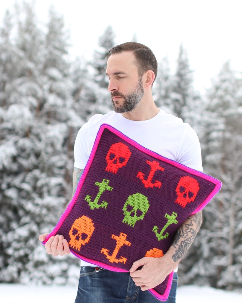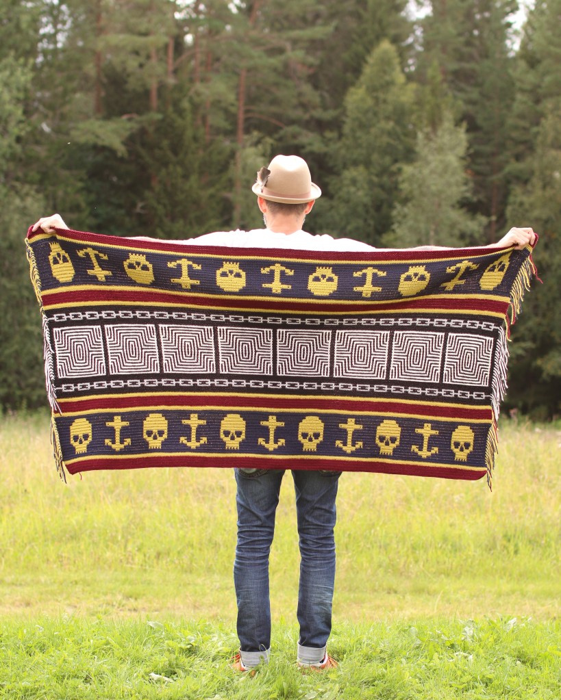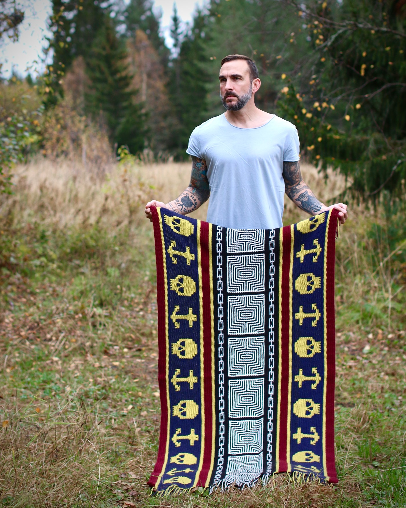 And a wrap/blanket that uses 4 more motives (the X, chains, upside down skulls and upside down anchors) which is available as a ready to print PDF pattern on Ravelry. HERE HERE HERE
