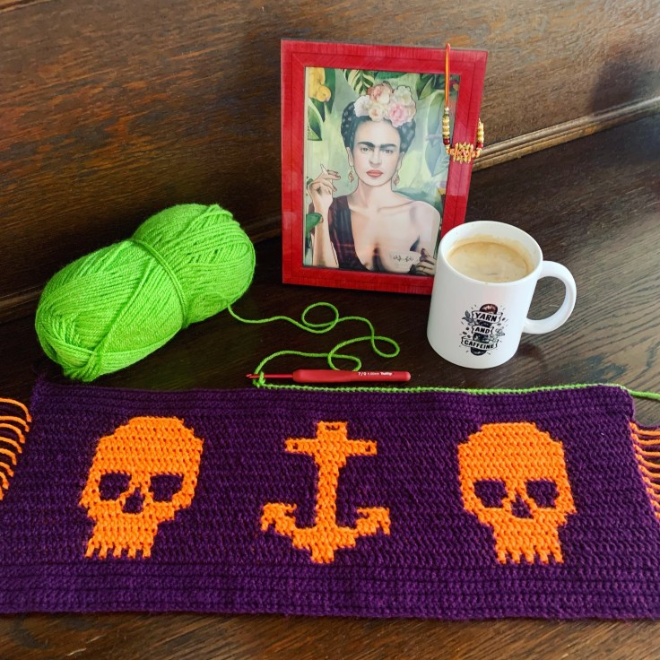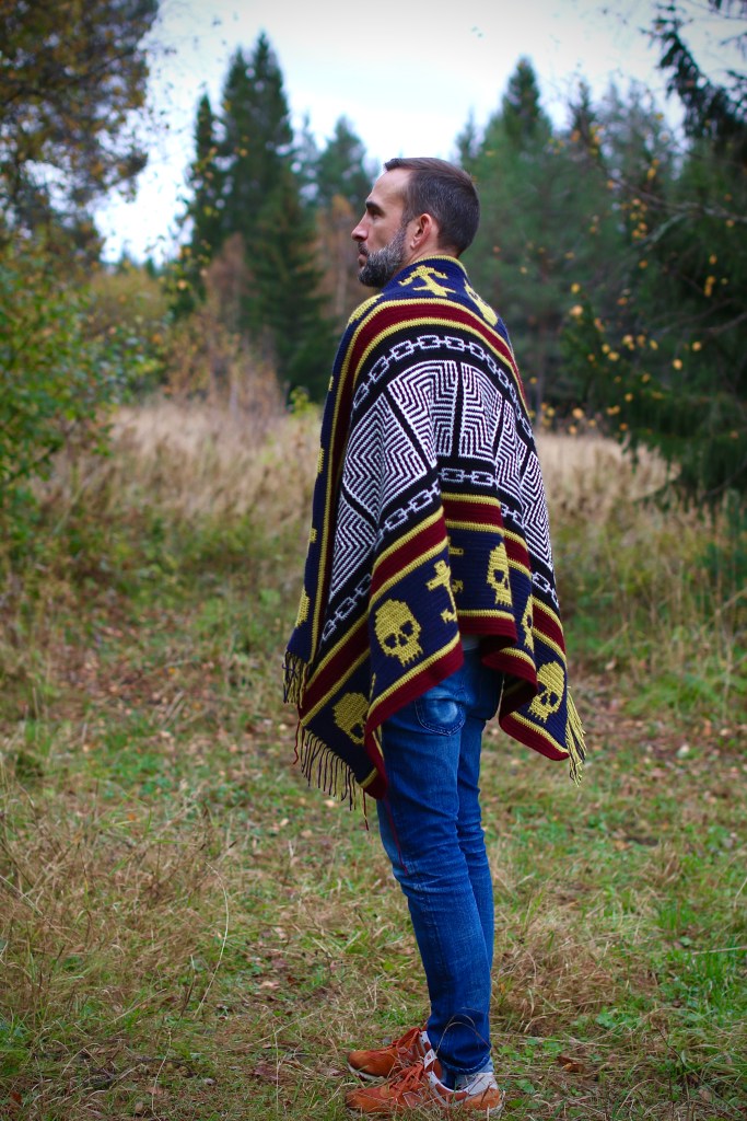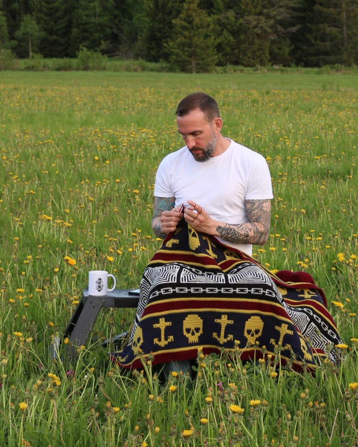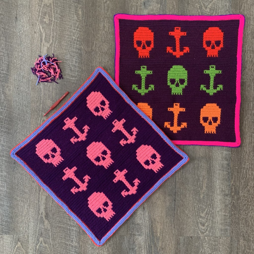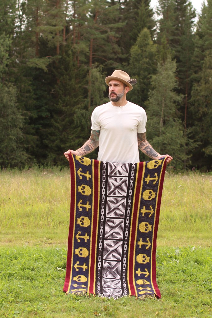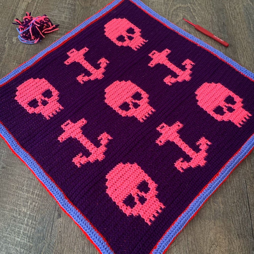 And a wrap/blanket that uses 4 more motives (the X, chains, upside down skulls and upside down anchors) which is available as a ready to print PDF pattern on Ravelry. HERE HERE HERE