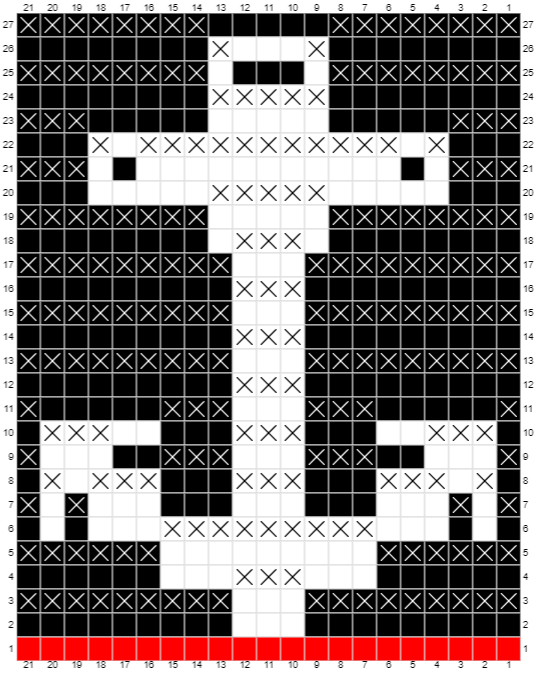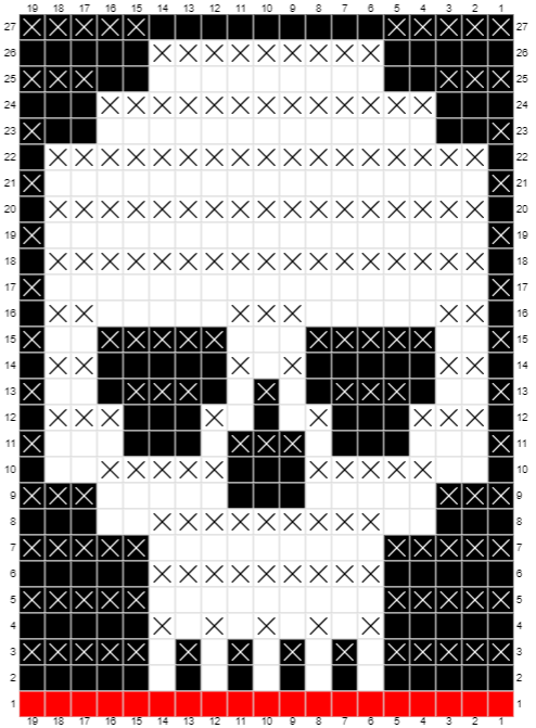 1sc, 11st, skull, 9st, anchor, 9st, skull, 11st, 1sc.