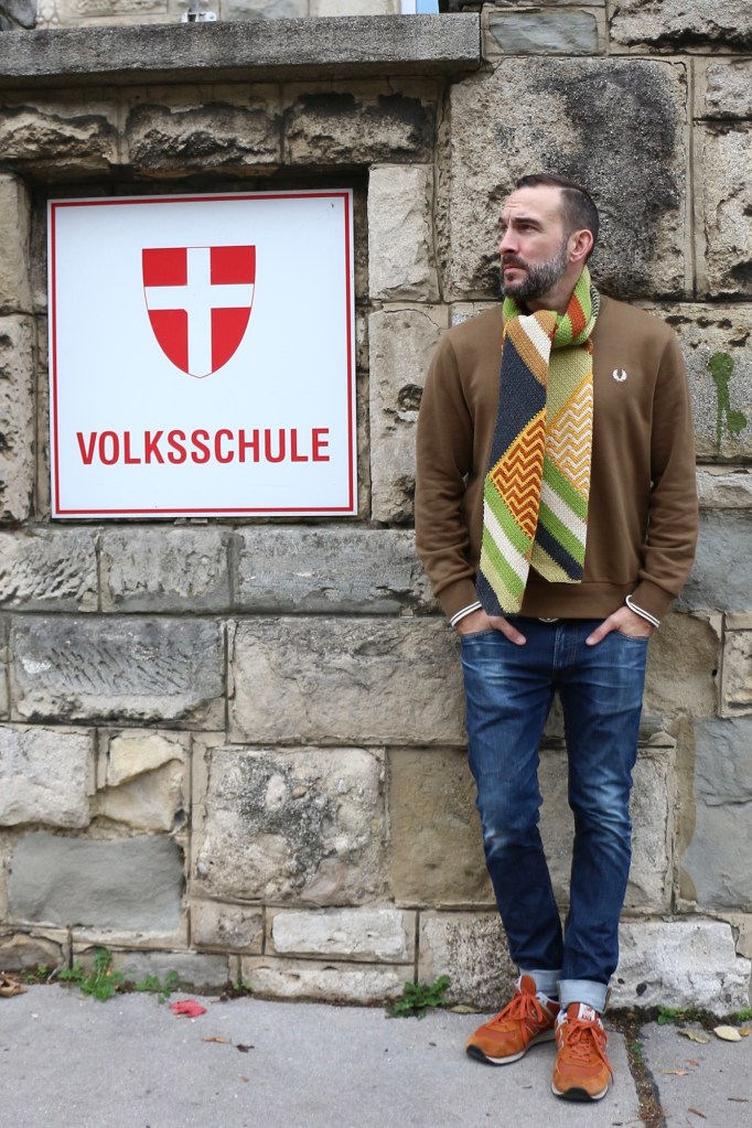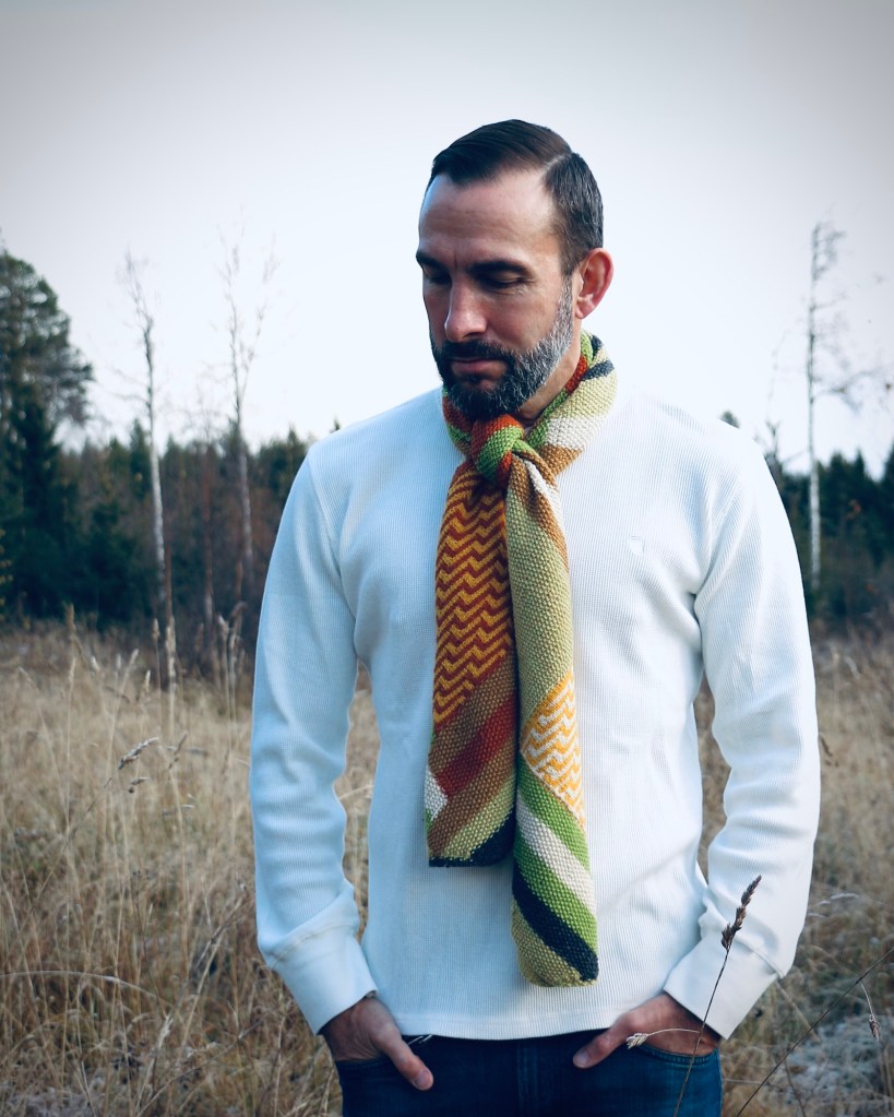 Both patterns are using the moss stitch and an integrated mosaic part (of course one in knitting and one in crochet). The crochet scarf is slightly wider and a little longer(26 x180cm) than the knitted version (25 x 170cm) but both scarfs are just fine to wear for adults and kids depending on how you bind it. The crochet pattern is not only inspired by the Goldcrest but even by the “French Braid” pattern by Cypress Textiles which I highly recommend if you want to dive deeper into the technique of moss stitch crochet.